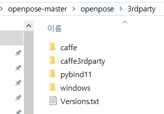 3rdparty는 clone한 openpose 폴더 안에 존재~ 이곳에서 3rdparty/windows/ 에 caffee들을 설치하면 된다.