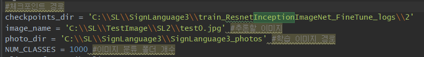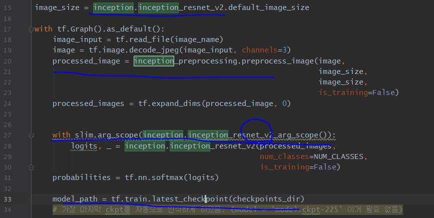 ResNet_v2를 이용하기 때문에 밑줄친 코드를 모두 수정해줘야 한다. 그중에서 33번째 코드는 기존 코드와 달리, 마지막 체크포인트를 인식하도록 한 것인데 이게 은근 편하다 ㅎㅅㅎ;;