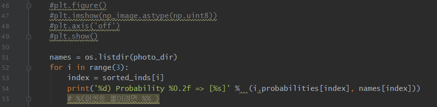 마지막으로 이부분은 선택인데, 나는 추론할 이미지를 한 번 더 확인하는 창이 너무 성가셔서 그냥 주석처리... 그리고 추론하면 3위까지 뜨는데, 인덱스를 매길 수 있도록 print함수에 추가했다.